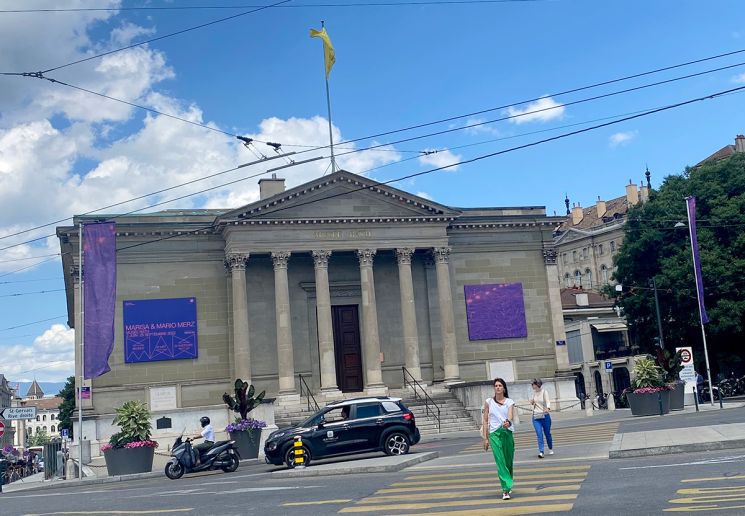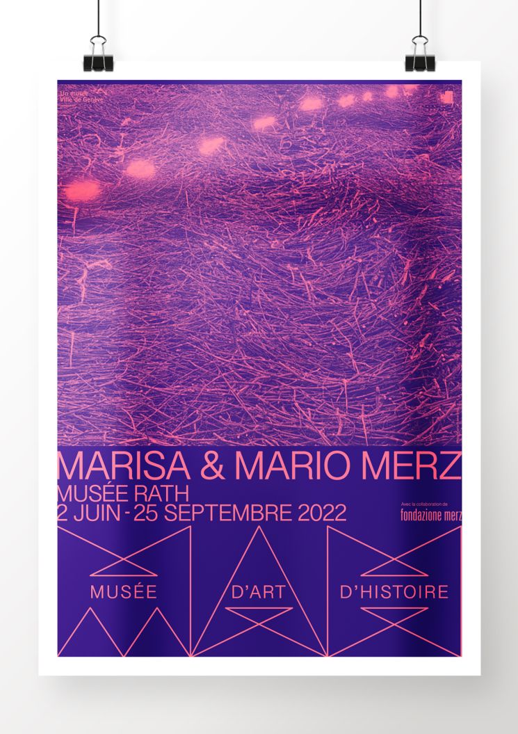 Création de l’univers visuel de l’exposition « Marisa & Mario Merz » au Musée Rath, Genève. Concept décliné sur l’ensemble des supports de communications : Affiche F4, dépliant, annonces print et digitales, oriflammes, façade extérieure Musée Rath, animations sur écran TPG et cinéma.