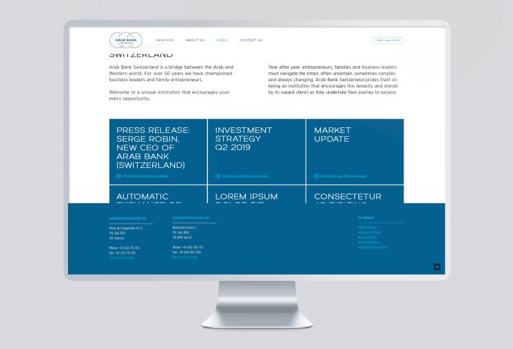 Création du site web de l’Arab Bank. Déclinaison de l’univers visuel, réflexion et insertion du shooting photo autour de la danse. www.arabbank.ch webmaster © Yann&Co Photographe © Loris Von Siebenthal